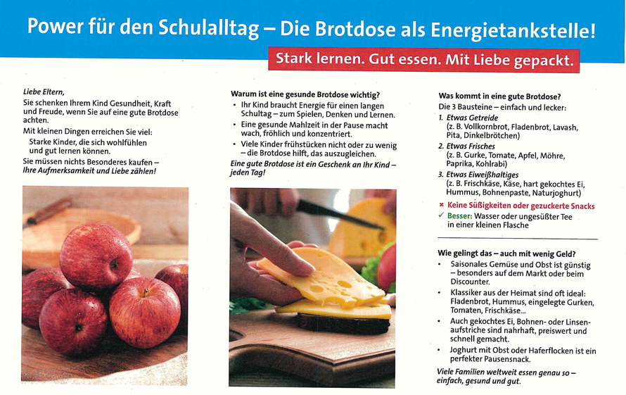 Passend dazu gibt es für jedes Kind einen Flyer mit nach Hause: „Power für den Schulalltag – Die Brotdose als Energietankstelle“. Darin finden sich viele Ideen, wie eine gesunde Pausenbox aussehen kann – und warum sie so wichtig für Konzentration und Lernen ist.